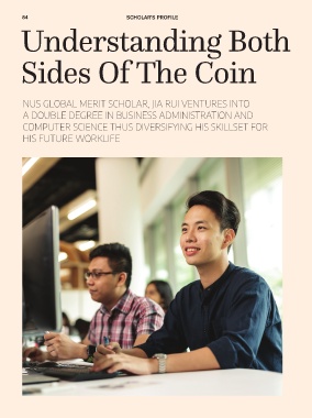 84 SCHOLAR’S PROFILE Understanding Both Sides Of The Coin NUS GLOBAL MERIT SCHOLAR, JIA RUI VENTURES INTO A DOUBLE DEGREE IN BUSINESS ADMINISTRATION AND COMPUTER SCIENCE THUS DIVERSIFYING HIS SKILLSET FOR HIS FUTURE WORKLIFE